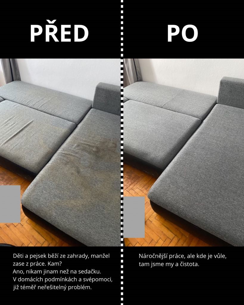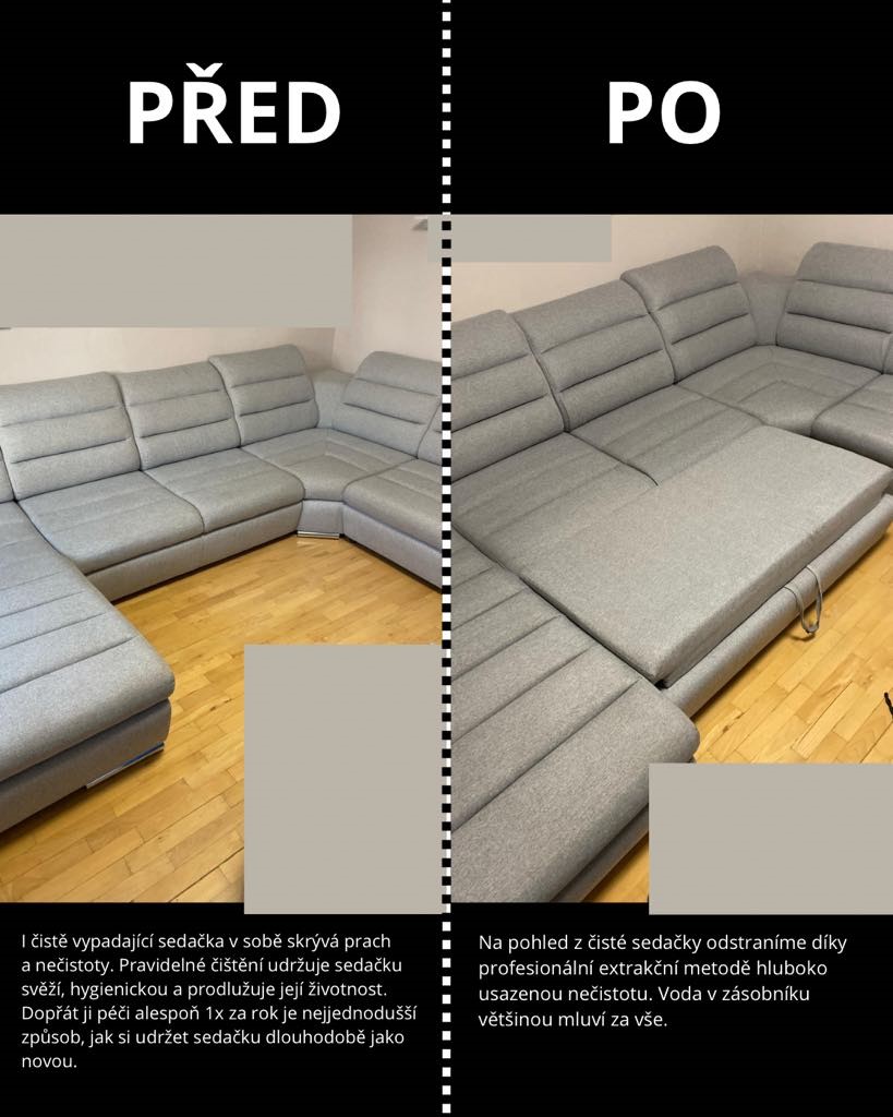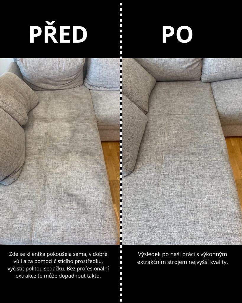 Jsme profesionální služba zaměřená na hloubkové čištění sedaček, koberců a čalounění. Pracujeme s jedním z nejúčinnějších extrakčních strojů na trhu, který dokáže odstranit i hluboko usazené nečistoty, alergeny a zápach.